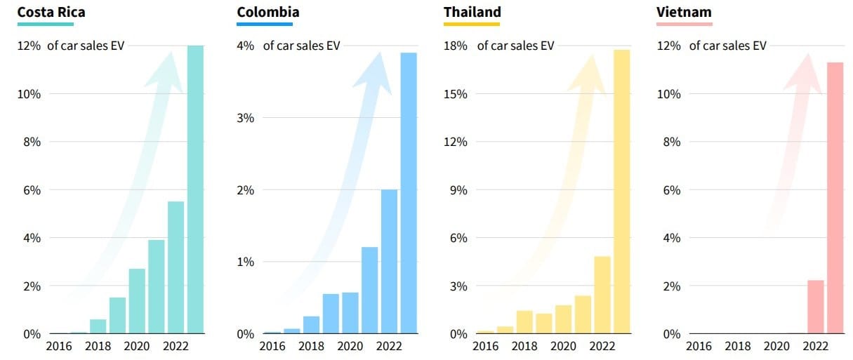 There is also no sign of a slowdown at the global level (Source: BNEF via Colin Mckerracher). Several developing countries are experiencing spectacular growth in EV sales (Source: RMI).