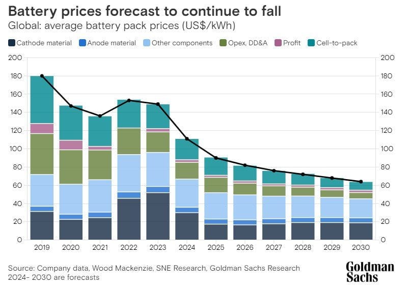 Technological advances designed to increase battery energy density, combined with a drop in green metal prices, are expected to push battery prices lower than previously expected... Goldman Sachs researchers further predict that average battery prices could fall as far as $80/kWh by 2026, equating to a drop of almost 50% from 2023 levels. It is at this point that the investment giant expects battery electric vehicles could potentially achieve cost parity with ICE vehicles in the United States on an unsubsidized basis.